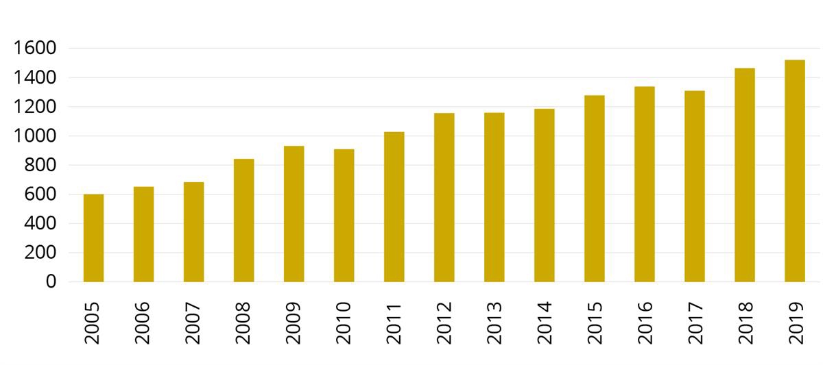 Med utgangspunkt i at disse tallene inkluderer både politi og andre offentlige tjenestepersoner, har Politidirektoratet selv skilt ut politi fra dette tallgrunnlaget, og laget et tallgrunnlag med anmeldte vold og trusler mot politi fra 2005 til 2019 (grunnet feil i politiets driftsregister i perioden 2020–2021 kan ikke anmeldelser etter straffeloven § 155 om vold og trusler mot offentlig tjenesteperson skille mellom vold/trusler eller politi/andre offentlige tjenestepersoner). Dette tallgrunnlaget er oversendt utvalget. Utviklingen i antall anmeldte vold og trusler mot politi er presentert i figur 209. Figuren viser en lineær økning i slike anmeldelser, fra 601 anmeldelser i 2005, til 1520 anmeldelser i 2019.