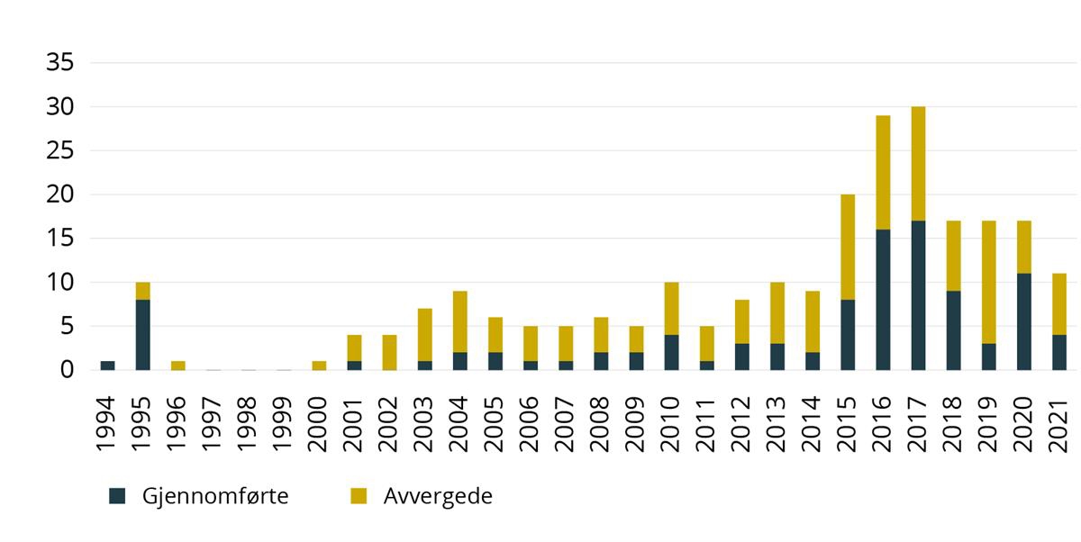I et statistikknotat utgitt 11. mars 2022 har Politidirektoratet delt informasjon om i hvilket omfang det er registrert at det norske politiet benyttet skytevåpen som maktmiddeli perioden 2009 – 2021, samt antall personer som ble skadet eller døde som følge av at politiet brukte skytevåpen. Selv om mandatet ber om en oppdatering av kunnskapsgrunnlaget etter 2017, har utvalget likevel funnet det hensiktsmessig å presentere statistikk fra tidligere år, da den longitudinelle endringen i politiets maktmiddelbruk er av betydning. Antall oppdrag totalt fremgår av figur 3. Utvalget har valgt å supplere tallene fra statistikknotatet med tall utvalget har fått oversendt fra Politidirektoratet.