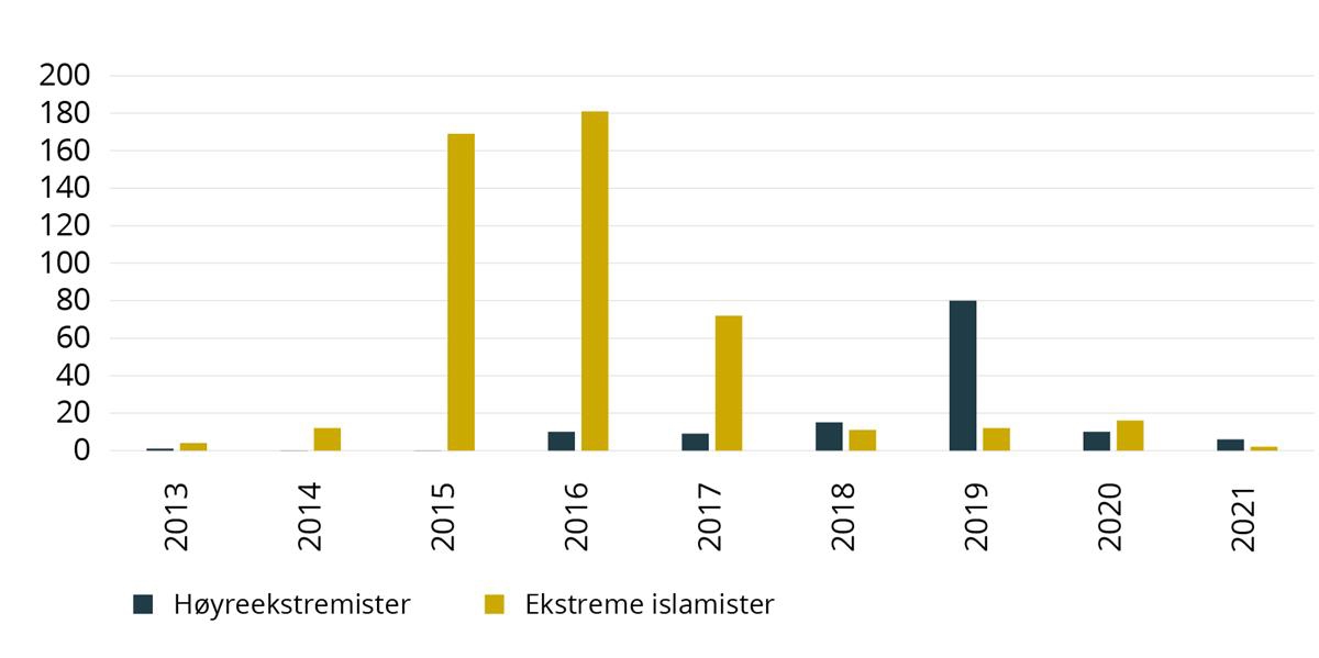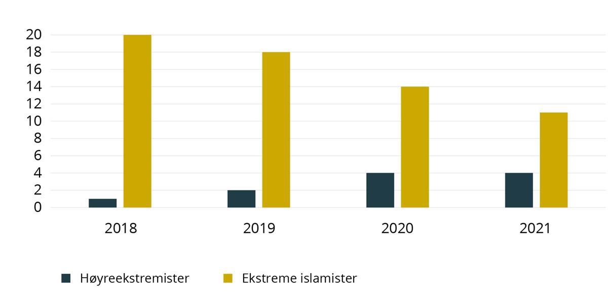 Ser man bort fra terrorangrepene 22. juli 2011, viser tallene at antall drap i Norge er forholdsvis stabile på i underkant av 30 drepte personer i Norge hvert år.142 I rapporten fremheves det også at da drapstallene i Norge er relativt lave, kan få saker gi betydelige prosentvise utslag på drapsoversikten. Omtrent en tredel av landets drapssaker blir begått i Oslo politidistrikt.143 I rapporten fremgår det at skytevåpen ble brukt i syv av drapssakene i 2021, noe som tilsvarer 30 % av sakene.144 For perioden 2011–2020 var andelen drap med skytevåpen 10 %. Andelen drap begått med skytevåpen var dermed en del høyere i 2021 enn i foregående år. Pistol var den vanligste typen skytevåpen, men også hagle ble benyttet i 2021.145 Omtrent 90 prosent av gjerningspersonene var menn, og omtrent 50 prosent av gjerningspersonene var ruspåvirket på drapstidspunktet.146