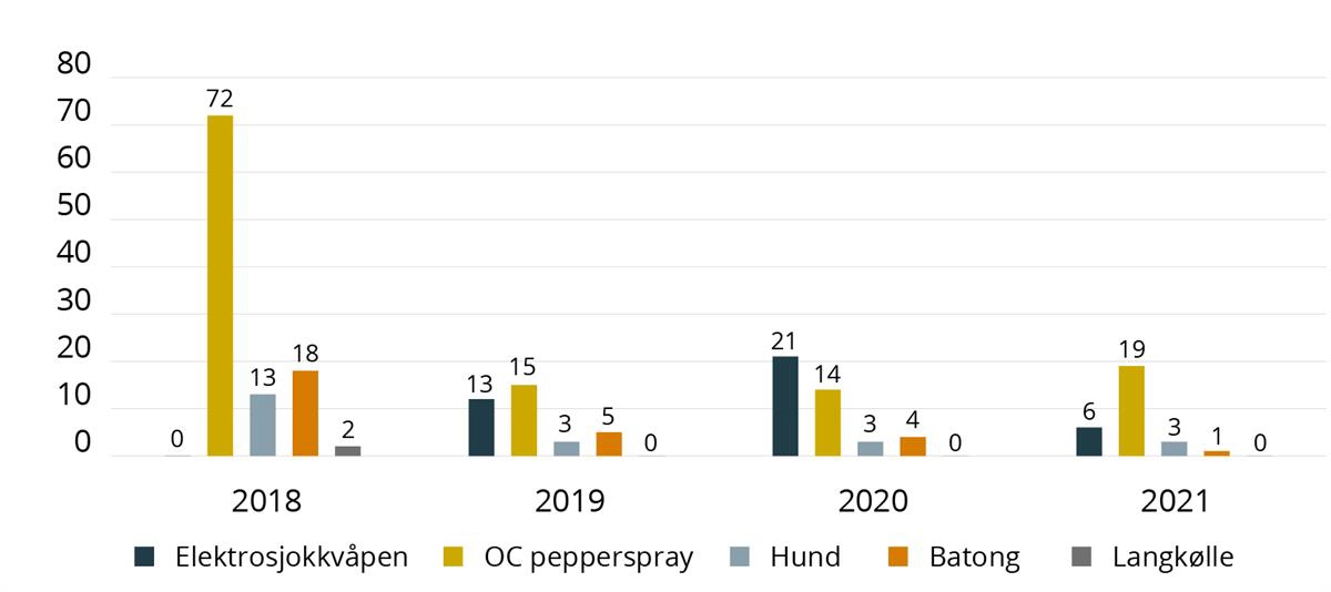 Som det fremgår av kapittel 7.2.1, sitter Politidirektoratet på relativt detaljerte tall om politiets bruk av skytevåpen. Politidirektoratet har derimot ikke offentliggjort tilsvarende tall om bruk av de øvrige maktmidlene, som for eksempel teleskopbatong og pepperspray. Utvalget har derfor måtte se til andre kilder for å forsøke å finne oppdaterte tall om dette.