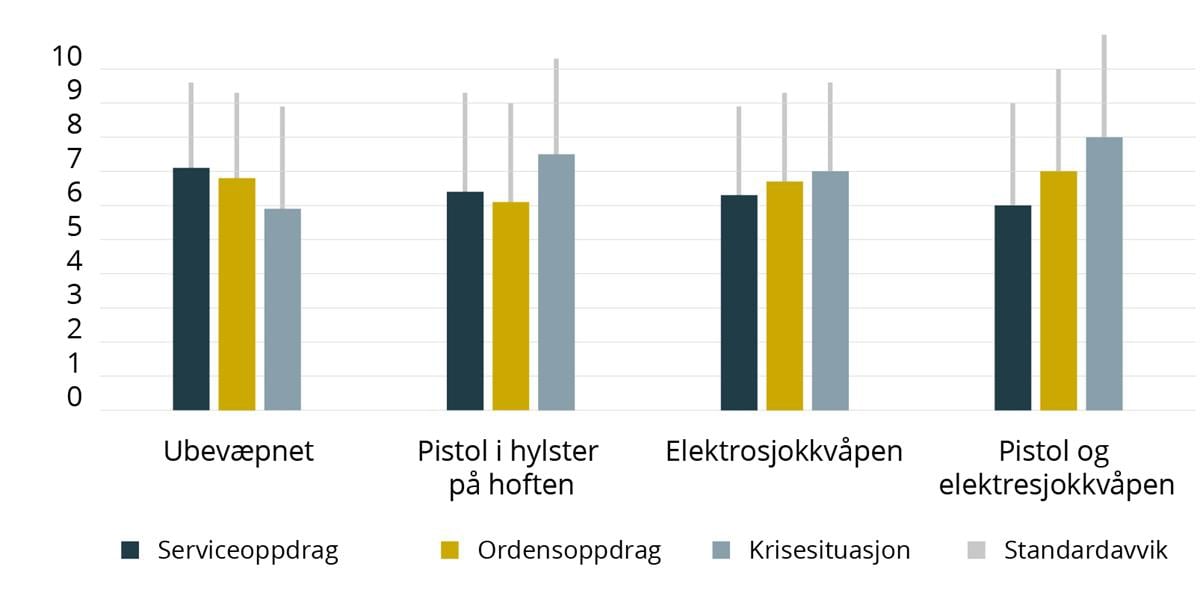Politihøgskolens evaluering av 14 måneder med midlertidig bevæpning viser tydelig at politiet hadde positive erfaringer fra perioden. Som det fremgår av rapporten var det «en ganske unison oppfatning at den generelle bevæpningen hadde økt deres trygghetsfølelse». Det fremgår også at tjenestepersonene i svært liten grad mente at bevæpningen hadde påvirket tjenesteutførelsen generelt, herunder kommunikasjonen med publikum. Det er verdt å merke seg rapportens fremheving av at det var «en betydelig ulikhet mellom situasjonsdefinisjonen i den politiske begrunnelsen for den midlertidige bevæpningen og årsakene til den praktiske aksepten for den i de operative miljøene». Dette samsvarer også med det inntrykket utvalget sitter igjen med etter å ha mottatt innspill fra politidistriktene, se omtale i kapittel 7.9. Der den politiske begrunnelsen primært har vært den forhøyede terrortrusselen, har tjenestepersonenes begrunnelse i større grad rettet seg mot trygghetsfølelse i mer ordinære oppdrag hvor det er usikkert hva man kan komme til å stå overfor. Utvalget har også merket seg at forskningsprosjektet har identifisert relativt kritiske holdninger til Politidirektoratets føring om når betjenter likevel skal være ubevæpnet i en bevæpnet periode. Etter utvalgets syn er slike unntak sentrale premisser for generell bevæpning, og resultatene til forskningsprosjektet gir således grunn til å sørge for at unntaksreglene reelt blir overholdt.