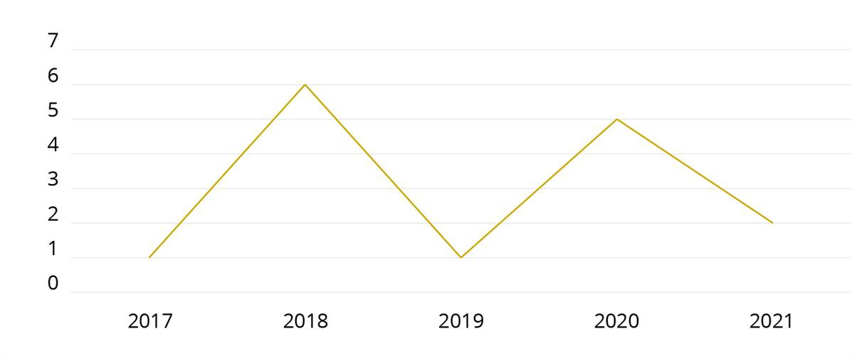 Antall skadde som følge av politiets skudd i perioden 2002 til 2021, fremgår av figur 7.116 Figuren viser at i perioden 2009 til 2021 er det registrert at mellom 0 og 5 personer ble skadet hvert år som følge av politiets skudd, uten at det er en spesiell tendens verken i økende eller i synkende retning.