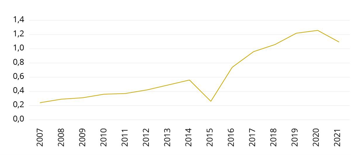 Figur 4. Antall oppdrag i prosent med bevæpning, av oppdragene som er registrert i politioperativt register (PO) i perioden 2007–2021