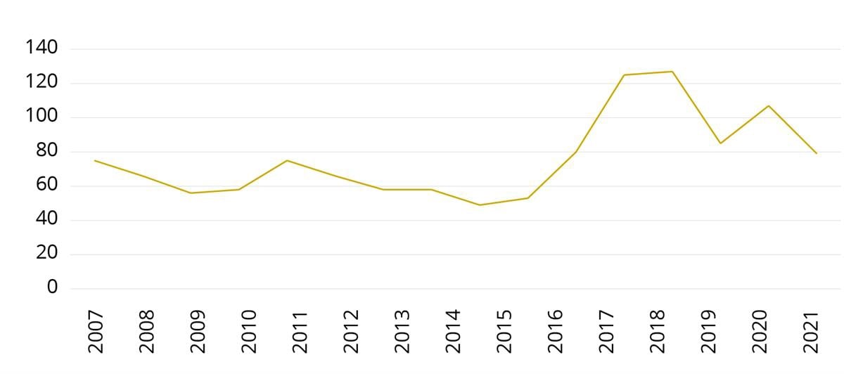 Statistikknotatet om politiets bruk av skytevåpen inneholder også en oversikt over antall registrerte oppdrag hvor politiet har truet med å bruke skytevåpen ved å rette skytevåpen mot en eller flere personer, og/eller har truet verbalt med at skytevåpen ville kunne bli brukt, i perioden 2006–2021 (figur 5).114 Figur 5 viser at frem til 2015 var denne andelen forholdsvis stabil på mellom 50–75 oppdrag i året, men at antallet registreringer av slike oppdrag steg til omkring 125 i årene 2017–2018, for deretter å synke. I 2021 var det 80 registrerte episoder hvor politiet truet med bruk av skytevåpen slik det er beskrevet over.