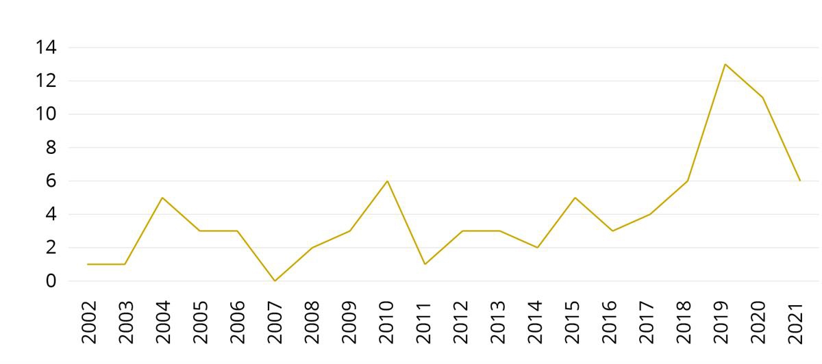 Figur 6. Antall ganger politiet avfyrte varselskudd og/eller rettede skudd mot en eller flere personer i perioden 2002–2021