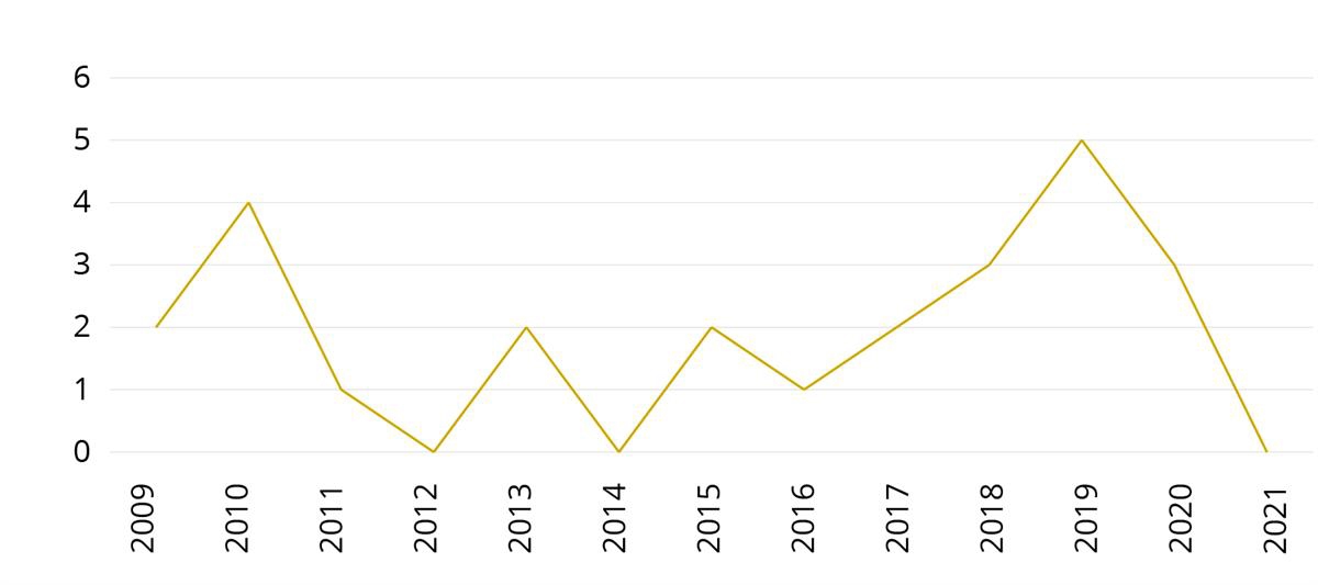 Figur 7. Antall skadde som følge av politiets skudd per år i perioden 2009 til 2021