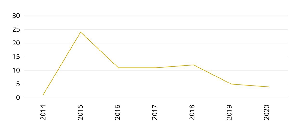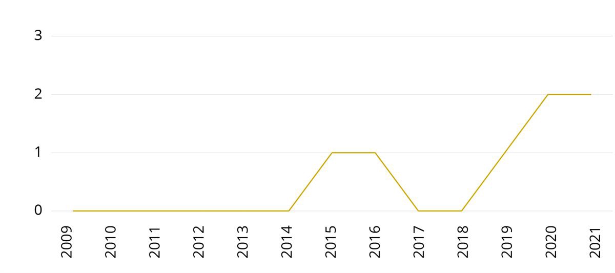 Antall registrerte varselskudd og/eller rettede skudd mot person eller objekt i perioden 2002 til 2021, fremgår også av statistikknotatet og er fremstilt i figur 6.115 Figuren viser at i perioden 2002 til 2018 varierte hyppigheten av slike registrerte skudd med mellom 0 og 6 ganger i året. I årene 2019 og 2020 er det imidlertid registrert henholdsvis 13 og 11 avfyrte skudd. I 2021 sank antallet til 6 skudd.