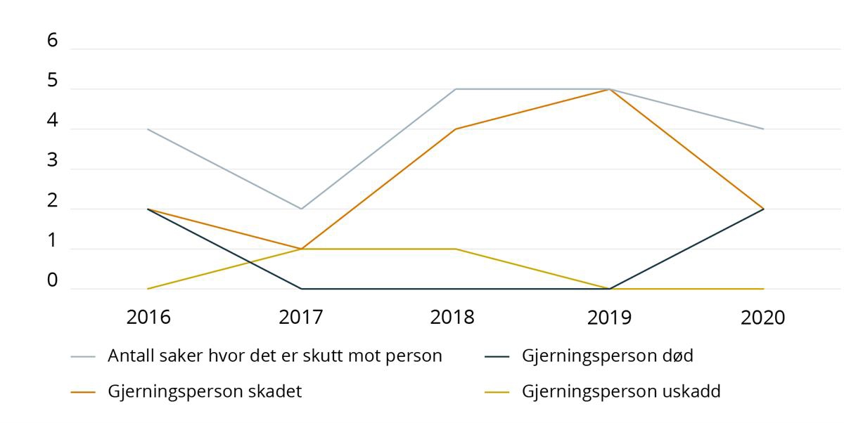Rigspolitiet fremhever at i alle fire tilfellene hvor personer ble skutt og drept, ble vedkommende oppfattet som er person som er «psykisk uligebevægtig». Av de totalt 390 innberetningene om bruk av skytevåpen i 2020 var gjerningspersonen i 100 av tilfellene selv bevæpnet med skytevåpen. I 185 av tilfellene var gjerningspersonen bevæpnet med stikkvåpen, og i 62 av tilfellene var gjerningspersonen bevæpnet med slagvåpen. I de resterende 43 tilfellene var det andre årsaker som var grunnen til at politiet brukte skytevåpen.397