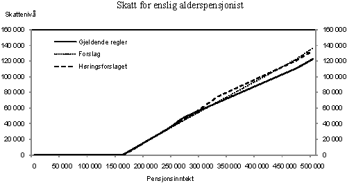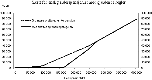 Ved stigende inntekt over beløpsgrensene blir skattebegrensningen gradvis redusert, inntil den faller helt bort. Nedtrappingen gjennomføres ved at inntekt over om lag minstepensjon blir skattlagt med 55 pst., inntil skattlegging etter de ordinære reglene for pensjonsinntekter gir lavere skatt. Figur 3.1 viser skatt for en enslig alderspensjonist som bare har pensjonsinntekt og ikke har andre fradrag enn standardfradrag eller nettoformue over 200 000 kroner, med ordinære skatteregler og med skattebegrensningsregelen. For denne pensjonisten innebærer den skattefrie nettoinntekten, i tillegg til minstefradraget, null i inntektsskatt inntil brutto pensjonsinntekt overstiger om lag 153 650 kroner i 2010, og redusert inntektsskatt inntil inntekten overstiger om lag 257 300 kroner. Tilsvarende kan et pensjonistektepar i 2010 ha en samlet brutto pensjonsinntekt på om lag 279 300 kroner før de betaler inntektsskatt, og 489 750 kroner før de betaler skatt etter ordinære regler.