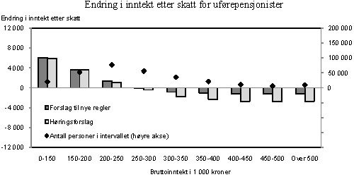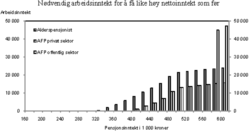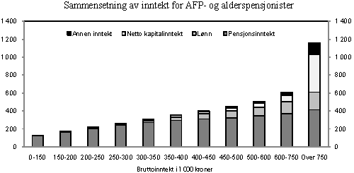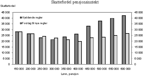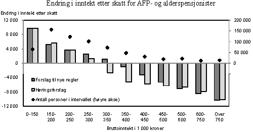 I budsjettet for 2011 foreslår Regjeringen endringer i pensjonsbeskatningen for å tilpasse skattesystemet til pensjonsreformen. Forslaget har gode fordelingsvirkninger. AFP- og alderspensjonister med under 350 000 kroner i bruttoinntekt får lettelser i gjennomsnitt. De største lettelsene går til pensjonister med inntekt under 150 000 kroner og er en følge av at det nye skattefradraget for pensjonistene fastsettes individuelt. I denne gruppen er det hovedsakelig gifte minstepensjonister. Om lag 59 pst. av AFP- og alderspensjonistene får en skattelettelse, om lag 11 pst. får uendret skatt, mens om lag 30 pst. får en skjerpelse. De som får økt skatt, har generelt god skatteevne, med relativt stor formue og kapitalinntekt og høyt utdanningsnivå.