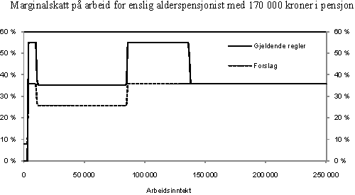 Et mål med pensjonsreformen er at det skal bli mer lønnsomt å arbeide etter fylte 62 år. Regelverket for ny alderspensjon i folketrygden legger derfor til rette for at en kan kombinere arbeidsinntekt med pensjonsinntekt uten at pensjonen avkortes. I tillegg styrkes sammenhengen mellom pensjonsgivende inntekt og framtidig opptjening av pensjonsrettigheter. Dagens skatteregler er tilpasset det gamle pensjonssystemet som er basert på at man i stor grad enten jobber eller tar ut pensjon. Det er derfor helt nødvendig å endre skattereglene for pensjonister.