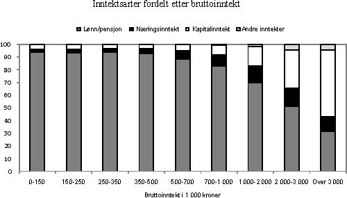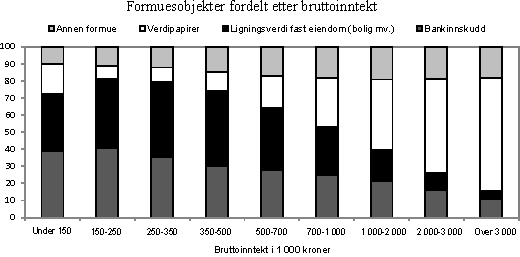 Figur 6.2 viser hvordan ligningsverdien av ulike formueskomponenter fordeler seg etter bruttoinntekt. Bruken av skattemessige verdier gjør at deler av formuen undervurderes, ettersom enkelte formuesobjekter verdsettes vesentlig lavere enn reelle verdier. Særlig er ligningsverdiene av bolig og annen fast eiendom fastsatt langt lavere enn omsetningsverdiene. Verdipapirer utgjør den største formueskomponenten for de aller rikeste, mens bankinnskudd og fast eiendom utgjør den største komponenten for de nedre inntektsgruppene. Fjerningen av aksjerabatten har bidratt til at den reelle formuen til dem med de største formuene skattlegges i langt større grad enn tidligere. Lave ligningsverdier av næringseiendom innebærer imidlertid at mange ikke-børsnoterte aksjer verdsettes langt lavere enn den reelle verdien.