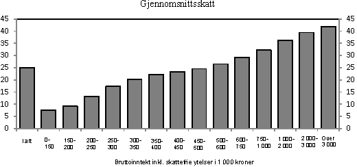 Figur 6.3 gir et bilde på hvordan skattebyrden (skatt som andel av bruttoinntekt inkludert skattefrie ytelser) er fordelt mellom personer på ulike inntektsnivåer. Figuren viser at skattesystemet er progressivt, dvs. at gjennomsnittsskatten øker med inntekten. Progressivitet i skattesystemet er et sentralt virkemiddel for å nå fordelingspolitiske mål.