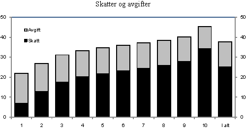 Figur 6.4 viser det samlede nivået på skatter og avgifter per person med dagens regler, målt i prosent av den justerte inntekten og fordelt på ulike inntektsgrupper. Befolkningen er rangert etter stigende inntekt i ti like store grupper (inntektsdesiler). Husholdningsmedlemmene i eksempel 1 i boks 6.2 vil for eksempel havne i inntektsgruppe 8, og husholdningsmedlemmene i eksempel 2 vil havne i inntektsgruppe 9. Figuren viser at personer med lave forbruksmuligheter (lav justert inntekt) også har lavere skatte- og avgiftsbelastning enn personer med høye forbruksmuligheter. Mens figur 6.3 illustrerer progressiviteten i skattesystemet som skatt i prosent av skattbar bruttoinntekt, illustrerer figur 6.4 størrelsen på skatter og avgifter i forhold til den justerte inntekten, som altså i større grad er ment å gi et bilde av en persons forbruksmuligheter.