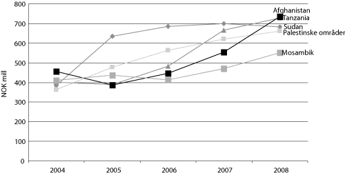 Tabell 7.5 Norske frivillige organisasjoner: De seks største mottakerne av norsk bistand, 2005–2008 (tall i mill. kroner)
