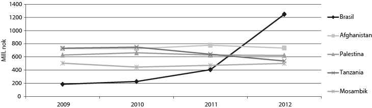 Figur 8.1 De fem største mottakerlandene av norsk bilateral bistand i 2012, perioden 2009–2012 (mill. kroner)