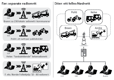 Figur 3.3 Overgang fra mange separate radionett til ett felles Nødnett