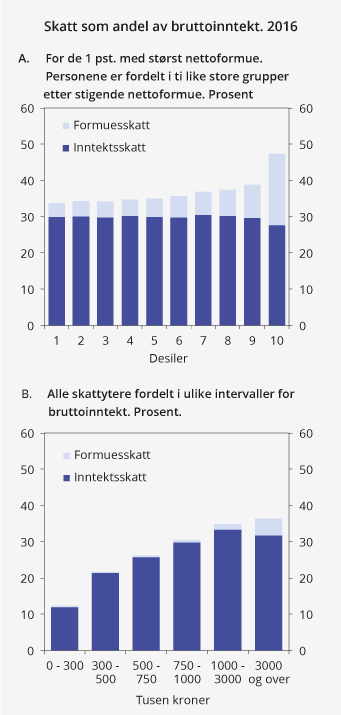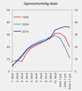 Figur 2.21 viser gjennomsnittlig fastsatt skatt som andel av bruttoinntekt for ulike inntektsgrupper i utvalgte år. Progressiviteten i skattesystemet kommer tydelig frem ved at gjennomsnittlig skatt i prosent av inntekten stiger med inntektsnivået. De med aller høyest inntekt betalte i 1994 og 2004 prosentvis mindre i skatt enn andre høy- og mellominntektsgrupper. Særlig har innføringen av utbytteskatt i skattereformen i 2006 økt den gjennomsnittlige skatten i prosent av inntekt for de øverste inntektsgruppene. Likevel faller gjennomsnittlig skatt i prosent av inntekt noe med nivået på inntekten i den øverste inntektsgruppen i 2016. Det har sammenheng med at kapitalinntekt utgjør en relativt stor andel av inntekten for høyinntektsgruppene.
