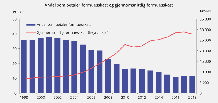 Formuesskatten er redusert med om lag 6,1 mrd. kroner. Lettelsene bidrar til å stimulere sparingen, tilførselen av norsk egenkapital og investeringer i næringsvirksomhet. Skattesatsen er redusert fra 1,1 til 0,85 pst., og bunnfradraget er økt fra 870 000 kroner til 1,48 mill. kroner. Det er innført en verdsettelsesrabatt på 20 pst. for aksjer og driftsmidler og tilordnet gjeld. Samtidig er formuesverdien av næringseiendom økt fra 50 til 80 pst. av anslått markedsverdi, formuesverdien av sekundærboliger er økt fra 50 til 90 pst., og formuesverdiene av fritidsbolig er økt med 10 pst. Det har bidratt til jevnere verdsettelse av formuesobjekter.