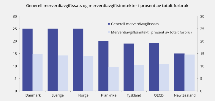 Figur 2.16 viser de generelle merverdiavgiftssatsene for Norge, OECD-gjennomsnittet og utvalgte andre land. Figuren viser også inntekt fra merverdiavgiften som andel av forbruk. Norge har en like høy generell merverdiavgiftssats som Danmark og Sverige, men inntektene fra merverdiavgift som andel av forbruk er likevel noe lavere. New Zealand har et svært bredt merverdiavgiftssystem med én felles sats og få unntak og fritak. Dermed beskattes tilnærmet alt forbruk med den generelle satsen, også offentlig forbruk.