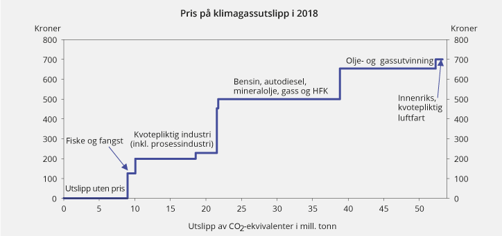 Det kan være flere grunner til at miljøavgifter eller kvotesystemer ikke er kostnadseffektivt utformet. Ofte skyldes det et ønske om å skjerme bestemte grupper eller næringer. Pris på utslipp av klimagasser i ulike sektorer i Norge er vist i figur 2.18. Ulike priser på utslipp av klimagasser øker de samlede kostnadene ved å redusere nasjonale utslipp.