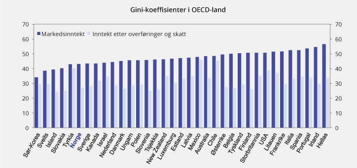 Figur 2.19 viser ulikhet målt med Gini-koeffisienten både for markedsinntekt og disponibel inntekt for OECD-land. Gini-koeffisienten angitt i prosent vil ha en verdi mellom 0 og 100. Ulikheten er større jo høyere Gini-koeffisienten er. Ved beregning av Gini-koeffisenten brukes ofte inntektsbegrepet «ekvivalent inntekt». Det er et inntektsbegrep som tar hensyn til at enkelte i husholdningen ikke har inntekt, og at det er stordriftsfordeler knyttet til at flere bor sammen. Det siste innebærer at den enkelte i en flerpersonshusholdning tilordnes en høyere inntekt enn husholdningens faktiske inntekt per person. Denne forhøyede inntekten anses som «ekvivalent» med inntekten til en enslig person (selv om faktisk inntekt er lavere).