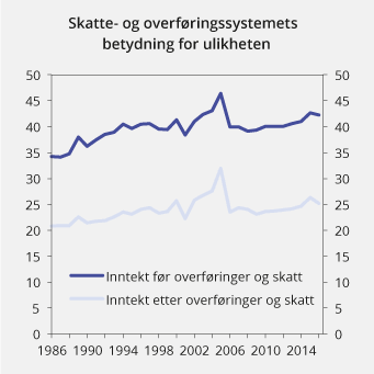 Figur 2.20 viser at inntektsulikheten målt ved Gini-koeffisienten har økt noe over den siste 30-årsperioden. En stor del av økningen skjedde tidlig i perioden. Svingninger rundt årene 2000, 2005 og 2015 må sees i sammenheng med endringer i skattereglene som har ført til midlertidige skattetilpasninger. I 2005 førte endringer i aksjebeskatningen til store uttak av aksjeutbytte som senere ble tilbakeført til bedriftene som egenkapital. I 2015 ble det gjort store uttak av utbytte for å unngå økt personskattesats på utbytte fra 2016. En flytting av inntekter frem og tilbake mellom selskap og personlig eier påvirker ikke de reelle inntektsforskjellene. Den slår likevel ut i ulikhetsmålet (Gini-koeffisienten), der utbytter til personlige eiere inngår i inntekt, men inntekter opparbeidet i selskap ikke gjør det. Overførings- og skattesystemets omfordelende betydning har vært forholdsvis stabil over perioden. Omfordelingen gjennom overføringer og skatt har redusert inntektsulikheten med rundt 40 pst. i de fleste år i perioden.