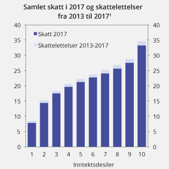 Figur 2.22 viser samlet skatt i 2017 og skattelettelser i perioden 2013–2017. Figuren viser at alle inntektsgruppene har fått skattelettelser, og at skattesystemet er tydelig progressivt både før og etter skattelettelsene i perioden. Skattelettelsene utgjør en liten andel av det samlede skattenivået for de ulike inntektsgruppene og påvirker progressiviteten i skattesystemet i begrenset grad. Figur 2.23 viser anslag på samlet skatt i 2018.