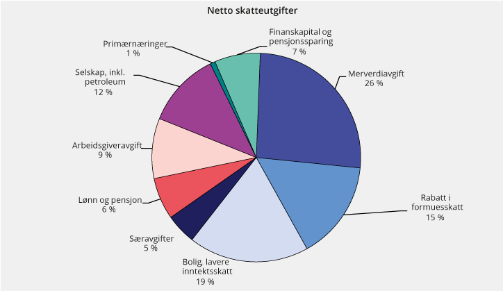 Figur 2.25 viser hvordan netto skatteutgifter i 2018 fordeles på ulike områder. Som figuren viser, er unntak i merverdiavgiftssystemet den største skatteutgiften og utgjør om lag 26 pst. av de samlede skatteutgiftene. Lavere inntektsskatt av bolig utgjør om lag 19 pst. av de samlede skatteutgiftene, mens rabatter i formuesskatten utgjør 15 pst. Skatteutgifter ved selskapsbeskatningen for petroleumsvirksomhet utgjør om lag 12 pst. Skatteutgifter ved finanskapital og pensjonssparing utgjør om lag 7 pst. av samlede skatteutgifter, mens den regionalt differensierte arbeidsgiveravgiften og skatteutgifter på lønn og pensjon utgjør henholdsvis 9 pst. og 6 pst. Særavgiftene utgjør 5 pst. av de samlede netto skatteutgiftene.