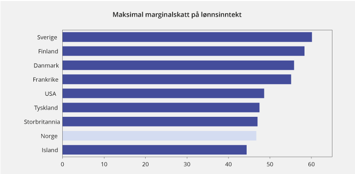 Den generelle merverdiavgiftssatsen i Norge er 25 pst. Danmark og Sverige har også en generell sats på 25 pst. Satsene i de skandinaviske landene er høye i internasjonal sammenheng. Inntektene fra merverdiavgiften som andel av BNP er høyere i Norge enn gjennomsnittet for OECD-landene, men noe lavere enn i Danmark og Sverige. I boks 2.5 sammenlignes merverdiavgiftssystemene i ulike OECD-land.