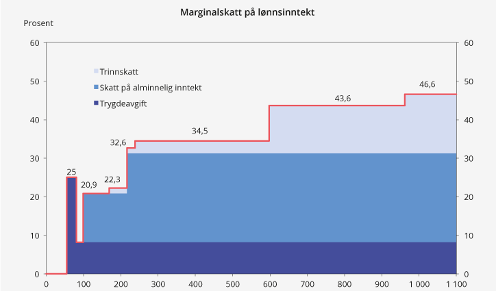 Marginalskattesatsen på arbeidsinntekt foreslås redusert for de aller fleste. Dette skjer ved at satsene i trinnskatten økes mindre enn reduksjonen i satsen på alminnelig inntekt. Satsene i trinnskatten økes med mellom 0,5 og 0,9 prosentenheter.
