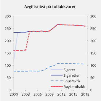 Det foreslås å innføre en sektoravgift på tobakksvarer fra 1. januar 2019. Inntekten skal dekke myndighetenes utgifter til etablering av ny bevillingsordning, tilsyn med bevillingshaverne samt etablering av et system for sporing og sikkerhetsmerking. Norge er forpliktet til å innføre disse ordningene etter både tobakkskonvensjonens protokoll mot ulovlig handel og EUs tobakksproduktdirektiv, jf. Prop. 75 L (2017–2018) Endringer i tobakksskadeloven (ulovlig handel med tobakksvarer mv.).