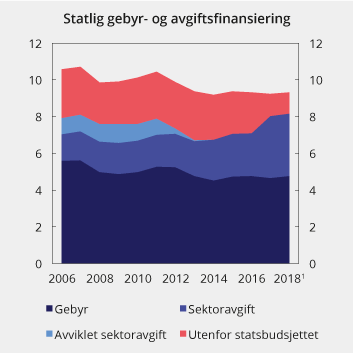 Gebyrinntektene har gått markert ned siden 2006, mens avgiftsfinansieringen er bare svakt redusert. Av en samlet gebyr- og avgiftsfinansiering på vel 9,2 mrd. kroner i 2017 stod gebyrinntektene for vel halvparten, mens sektoravgifter utgjorde i underkant av 3,4 mrd. kroner og avgifter utenfor statsbudsjettet omtrent 1,2 mrd. kroner. Bompengefinansiering, lufthavnavgifter, kringkastingsavgiften, egenandeler i helsevesenet, låne- og garantigebyrer og mulkter eller straffegebyrer inngår ikke i disse tallene.