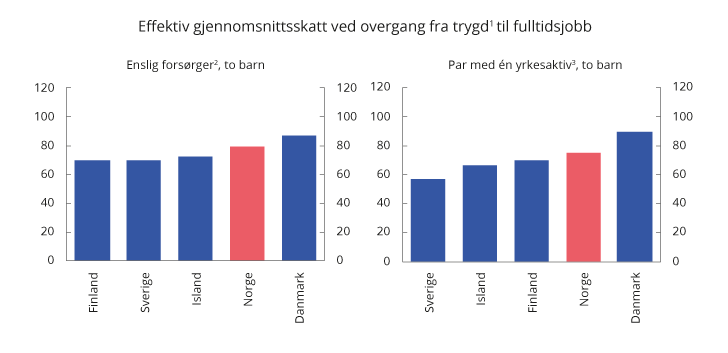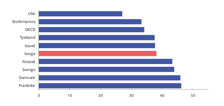 Figur 2.19 viser at overføringer og skatter i betydelig grad bidrar til å redusere ulikheten i de fleste land, og at Norge er blant OECD-landene med relativt lav ulikhet. Høy yrkesdeltakelse, lav arbeidsledighet og et stort innslag av sentraliserte lønnsforhandlinger bidrar til at Norge har små inntektsforskjeller før skatt og overføringer. Et godt utbygd, offentlig finansiert utdanningssystem gir også et viktig bidrag til utjevning av sosiale forskjeller.2 I tillegg forsikrer offentlige overføringsordninger mot bortfall av inntekt ved sykdom, uførhet, høy alder og tap av arbeid.