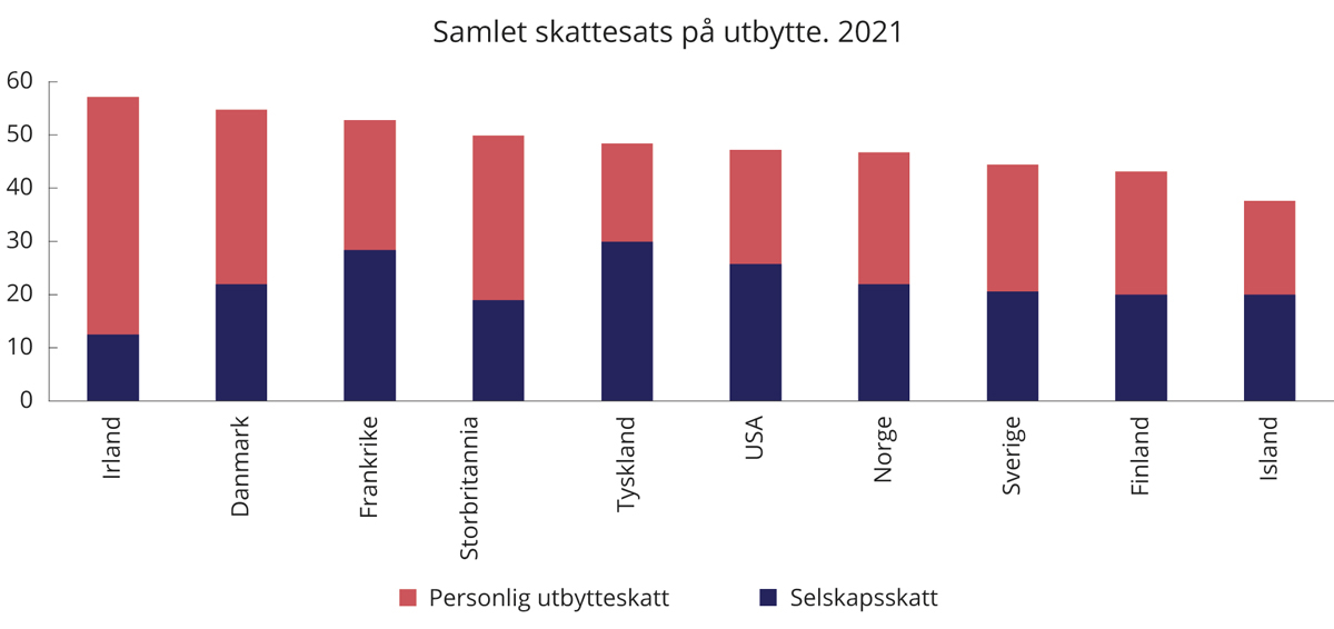 Norske og utenlandske eiere beskattes forskjellig avhengig av det enkelte lands innretning av skattesystemet når det gjelder eiendom, formue, selskapsoverskudd, gevinster mv. Samlet beskatning av kapitalinntekter i Norge er ikke spesielt høy i forhold til land det er naturlig å sammenligne seg med, se figur 16.1. I 2021 har Norge den niende høyeste utbytteskatten blant OECD-landene hvis man bare ser på personskatten (31,68 pst.), og den 13. høyeste skattesatsen hvis man ser på samlet marginalskatt (46,7 pst.), det vil si inkludert skatten som betales av selskapet. Gjennomsnittet for OECD er henholdsvis 25,5 pst. og 41,6 pst.