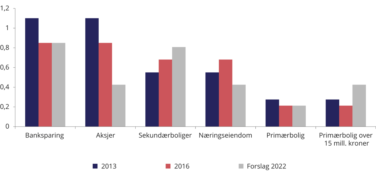 Figur 16.2 viser endringen i formuesskattereglene fra 2013. Det ble i 2017 innført en egen lavere verdsettelse av aksjer, driftsmidler mv. Denne er redusert hvert år og er 50 pst. med forslaget i 2022. Samtidig økes verdsettelsen av sekundærboliger fra 50 pst. i 2013 til 95 pst. med regjeringens forslag. Samlet har dette gjort at det nå er langt mer gunstig å investere i aksjer og arbeidsplasser enn i en ekstra bolig.