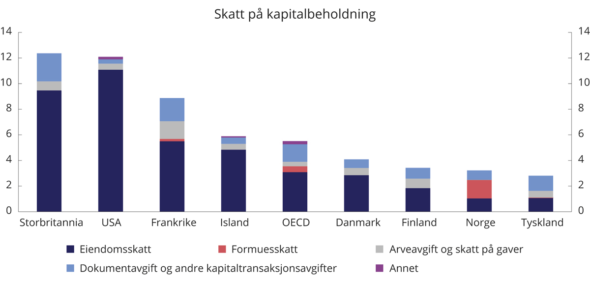 Skatt på kapitalbeholdning kan bestå av ulike skatteformer, blant annet formuesskatt, eiendomsskatt, dokumentavgift og skatt på arv og gaver. Norge skiller seg ut som et av få land med formuesskatt, men også ved at vi ikke har arveavgift. Den samlede skatten på kapitalbeholdning i Norge er relativt lav sammenlignet med andre land, se figur 16.3. Forskjellen skyldes imidlertid særlig eiendomsskatt i andre land. Dersom vi holder eiendomsskatt utenfor, viser figuren at øvrig skatt på kapitalbeholdning er høy i Norge sammenlignet med de andre landene.
