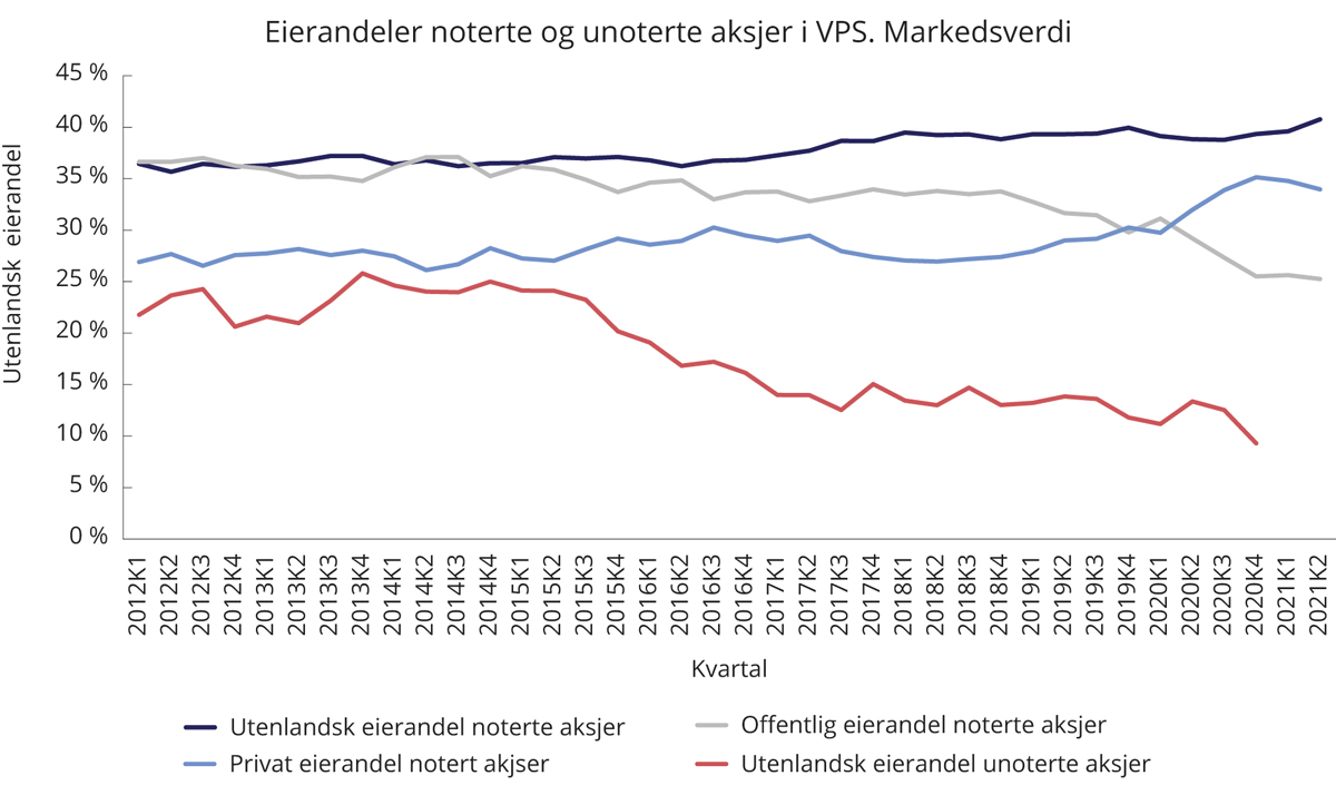 Det har også vært en klar vekst i andelen norsk privat eierskap av noterte aksjer gjennom perioden, fra ca. 27 pst. til i underkant av 35 pst. Utenlandsk eierskap i noterte aksjer utgjør om lag 40 pst., tilsvarende den utenlandske eierandelen av aksjer notert på Stockholmsbørsen. En forskjell på eierskapet i norske og svenske børsnoterte selskaper er at det statlige eierskapet er vesentlig høyere i Norge. Statlig eierskap av børsnoterte selskaper har imidlertid falt betydelig de senere årene. Utenlandsk eierskap i norske bedrifter er hovedsakelig konsentrert om større bedrifter i næringer som petroleum, industri, informasjons- og kommunikasjonsteknologi og faglig og forretningsmessig tjenesteyting, mens det er mindre dominerende i andre næringer og tilnærmet fraværende innenfor tjenesteytende næringer.