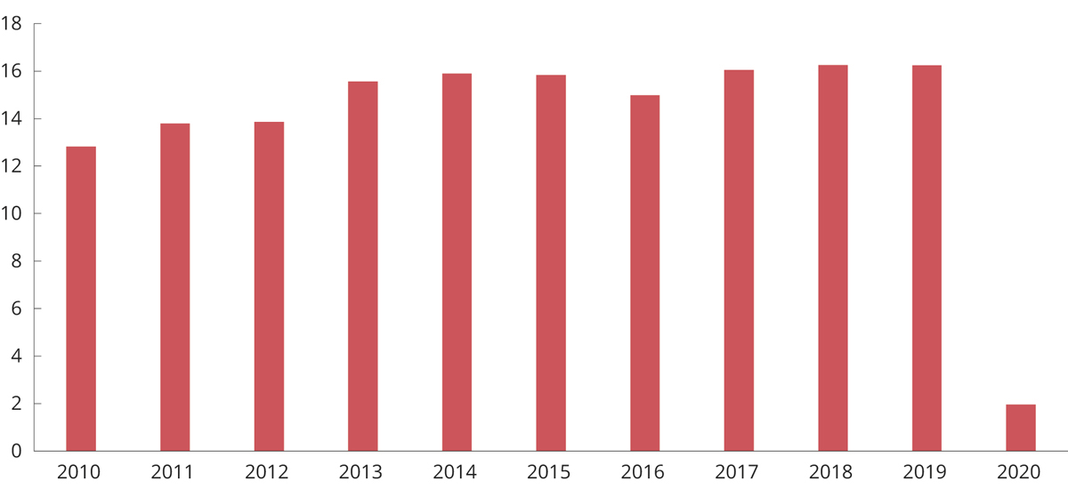 1 Avgiften på alkoholfrie drikkevarer ble redusert med 28,5 pst. 1. juli 2020. Inntektstallene for 2020 er derfor ikke direkte sammenlignbare med tallene for 2019.