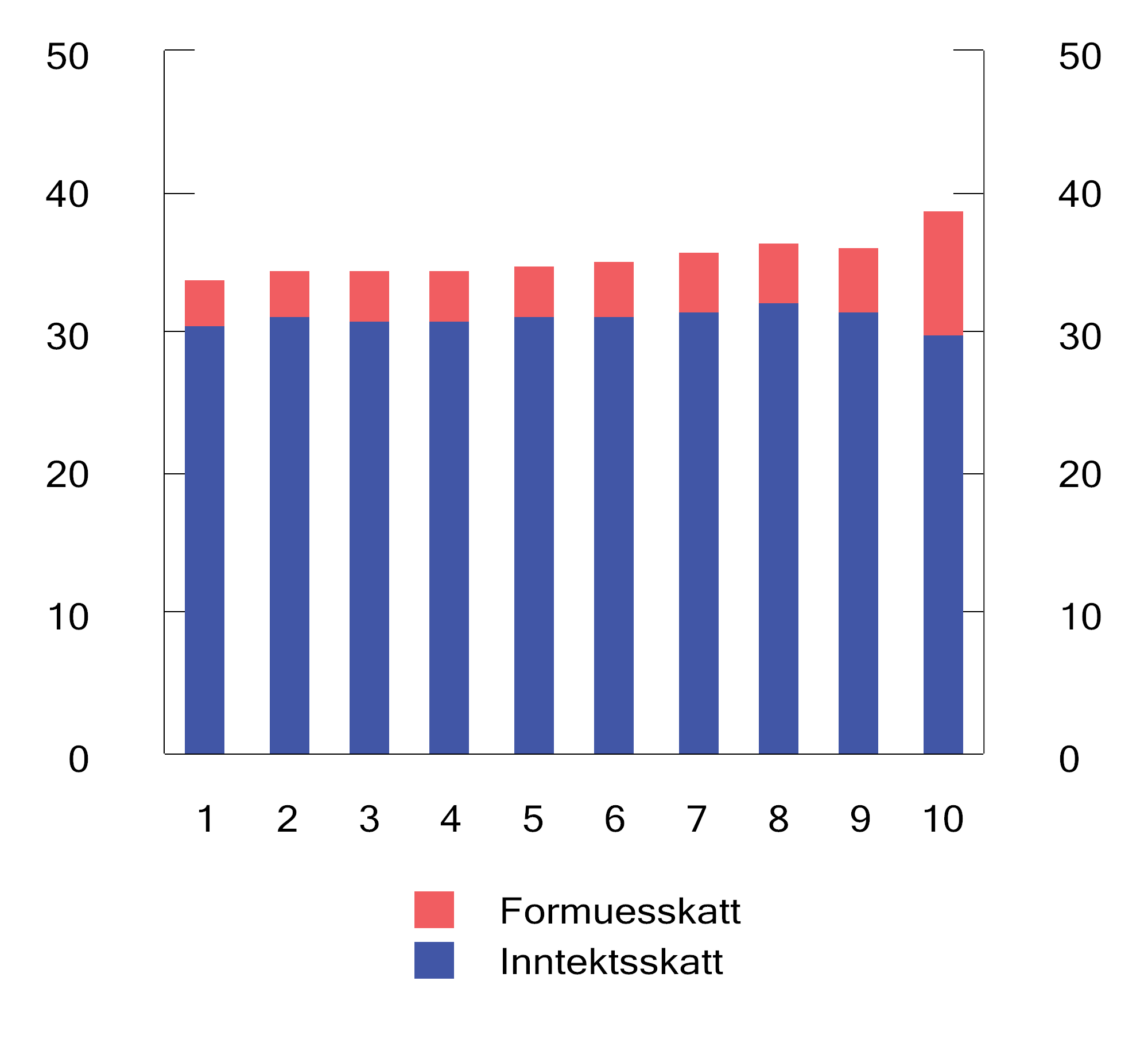 Figur 2.23 Skatt og avgift per person i prosent av ekvivalent inntekt etter inntektsdesiler. 2023-regler. Prosent