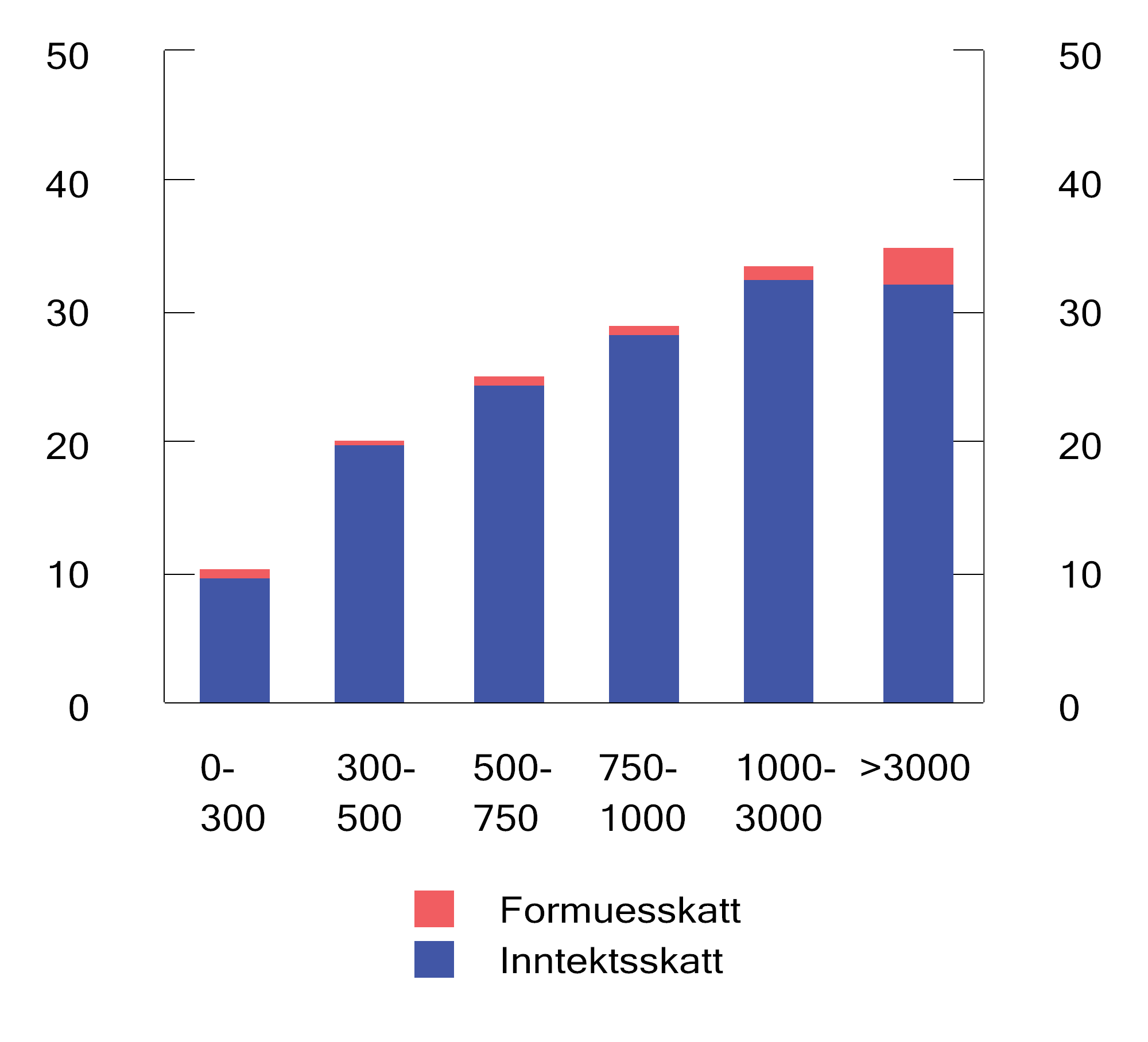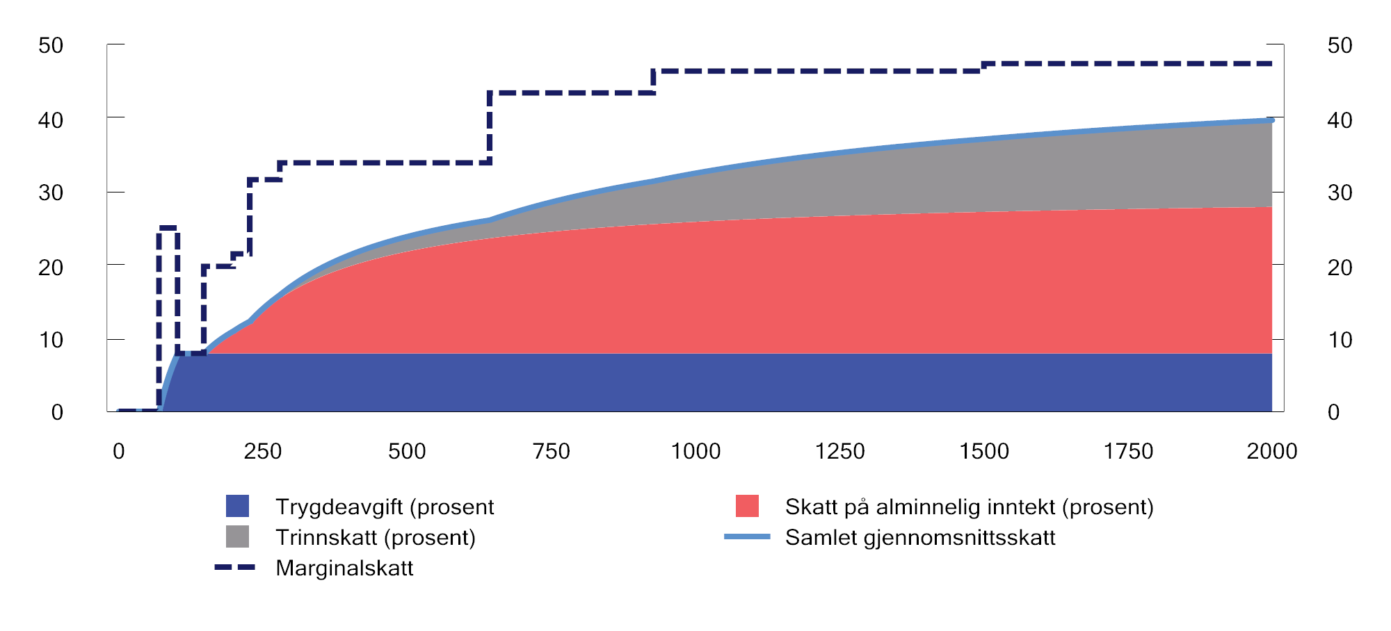 Figuren viser at personer med lave inntekter har lavere samlet skatte- og avgiftsbelastning enn personer med høye inntekter. Samtidig bidrar avgiftene til å svekke progressiviteten i skatte- og avgiftssystemet. Dette skyldes delvis at beregningene tar utgangspunkt i husholdningenes bruttoinntekt. Personer med høy bruttoinntekt betaler en større andel av bruttoinntekten i skatt enn personer med lav bruttoinntekt og har dermed en mindre andel av inntekten disponibel til forbruk. Det er inntekten etter skatt som kan forbrukes og belastes med avgifter. For en person med høy bruttoinntekt vil dermed avgiftene utgjøre en mindre andel av bruttoinntekten enn for en person med lav bruttoinntekt. Dersom beregningene var basert på inntekt etter skatt (disponibel inntekt), ville avgiftsbelastningen vært jevnere som andel av inntekt i de ulike inntektsgruppene.