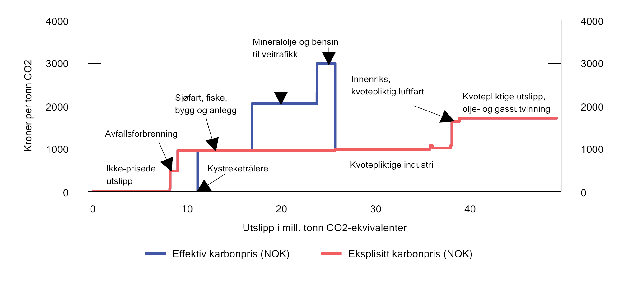 Figur 2.20 viser for eksempel at kvotepliktige utslipp i olje- og gassnæringen står overfor en eksplisitt karbonpris på 1 706 kroner og har et samlet utslipp på 10,3 millioner tonn. Kystreketrålerne betaler CO2-avgift på mineralske produkter, men mottar samtidig et tilskudd basert på hvor mye drivstoff de forbruker gjennom Garantikassen for fiskere. Tilskuddet er om lag like stort som avgiften målt i kroner per liter drivstoff, og den samlede netto effektive karbonprisen for næringen er derfor 11 kroner per tonn CO2.