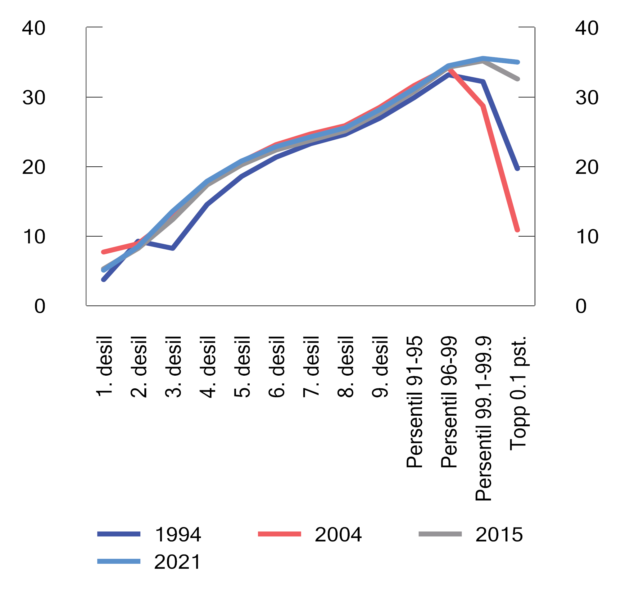 Progressivitet i inntektsskattesystemet sikrer en direkte omfordeling ved at de som tjener mest, også bidrar mer. Figur 2.22 viser gjennomsnittlig fastsatt skatt som andel av bruttoinntekt for ulike inntektsgrupper i utvalgte år. Progressiviteten i skattesystemet kommer tydelig frem ved at gjennomsnittlig skatt i prosent av inntekten stiger med inntektsnivået. Progressiviteten har økt de siste tiårene i den øverste delen av inntektsfordelingen. De med aller høyest inntekt betalte prosentvis mindre i skatt i 1994 og 2004 enn andre høy- og mellominntektsgrupper. Særlig har innføringen av utbytteskatt i skattereformen i 2006 økt den gjennomsnittlige skatten i prosent av inntekt for de øverste inntektsgruppene. Likevel avtar fortsatt progressiviteten helt i toppen av fordelingen. Dette henger sammen med at kapitalinntekter utgjør en større andel av inntekten for de med høyest inntekt. Disse inntektene skattlegges med en flat sats som er lavere enn satsen for høye arbeidsinntekter.