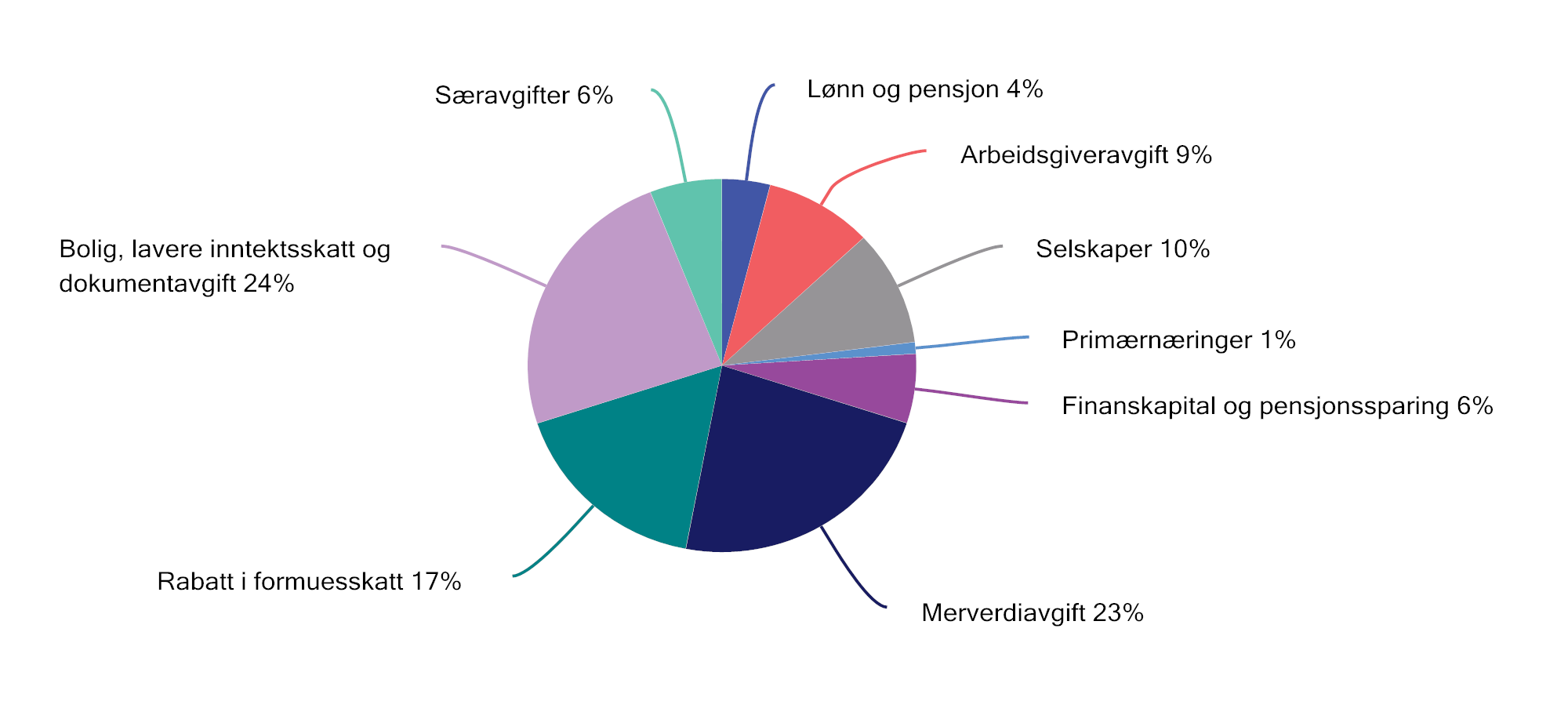 Figur 2.24 viser hvordan netto skatteutgifter i 2023 fordeles på ulike områder. Lavere inntektsskatt og dokumentavgift for bolig utgjør 24 pst. av de samlede skatteutgiftene, mens unntak i merverdiavgiftssystemet utgjør om lag 23 pst. av de samlede skatteutgiftene. Skatteutgifter ved selskapsbeskatningen medregnet petroleumsvirksomhet utgjør om lag 10 pst. Rabatter i formuesskatten utgjør 17 pst. av de samlede skatteutgiftene. Skatteutgifter ved finanskapital og pensjonssparing utgjør om lag 6 pst. av samlede skatteutgifter, mens den regionalt differensierte arbeidsgiveravgiften og skatteutgifter på lønn og pensjon utgjør henholdsvis 9 pst. og 4 pst. Særavgiftene utgjør 6 pst. av de samlede netto skatteutgiftene, og primærnæringer utgjør 1 pst.