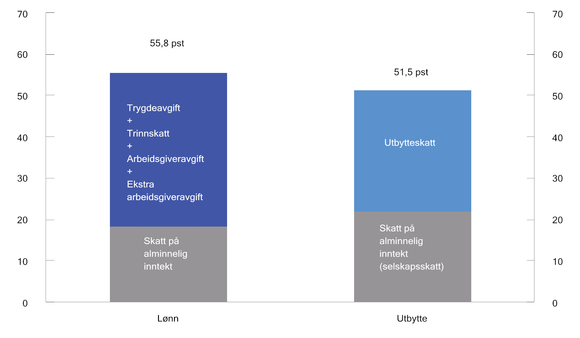 Helårsvirkningen av det samlede skatte- og avgiftsopplegget for 2024 innebærer lettelser på om lag 6,0 mrd. kroner. Av dette utgjør fjerning eller utfasing av de midlertidige skatteøkningene i vedtatt 2023-budsjett 5,1 mrd. kroner (høyprisbidrag og ekstra arbeidsgiveravgift for inntekter over 750 000 kroner).1 Det anslås at om lag 85 pst. av skattyterne får om lag uendret eller lavere inntektsskatt av regjeringens forslag for 2024. De to vedtatte budsjettene siden regjeringsskiftet ble anslått å gi om lag uendret eller lavere skatt for om lag 8 av 10 skattytere.