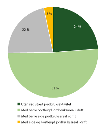 Av dei 184 400 registrerte landbrukseigedommane i 2016 har om lag 163 000 eigedommar (88 pst.) minst 5 dekar eigd jordbruksareal. Av dei har om lag 51 pst. av eigedommane jordbruksareal som berre blir drive ved bortleige. Om lag 22 pst. av eigedommane blir drivne berre ved hjelp av eige jordbruksareal, jf. figur 3.4 som viser landbrukseigedommar med minst 5 dekar eigd jordbruksareal i 2016. Tala for åra 2015 og 2016 viser ein auke for eigedommar som har areal som anten blir drive av eigaren sjølv eller av andre ved bortleige, ein nedgang i talet på eigedommar der eigaren sjølv òg er brukar av areala, og ein nedgang i talet på eigedommar som berre blir drivne ved bortleige. For eigedommane med minst 5 dekar eigd jordbruksareal var den gjennomsnittlege arealstorleiken på jordbruksarealet om lag 67 dekar.