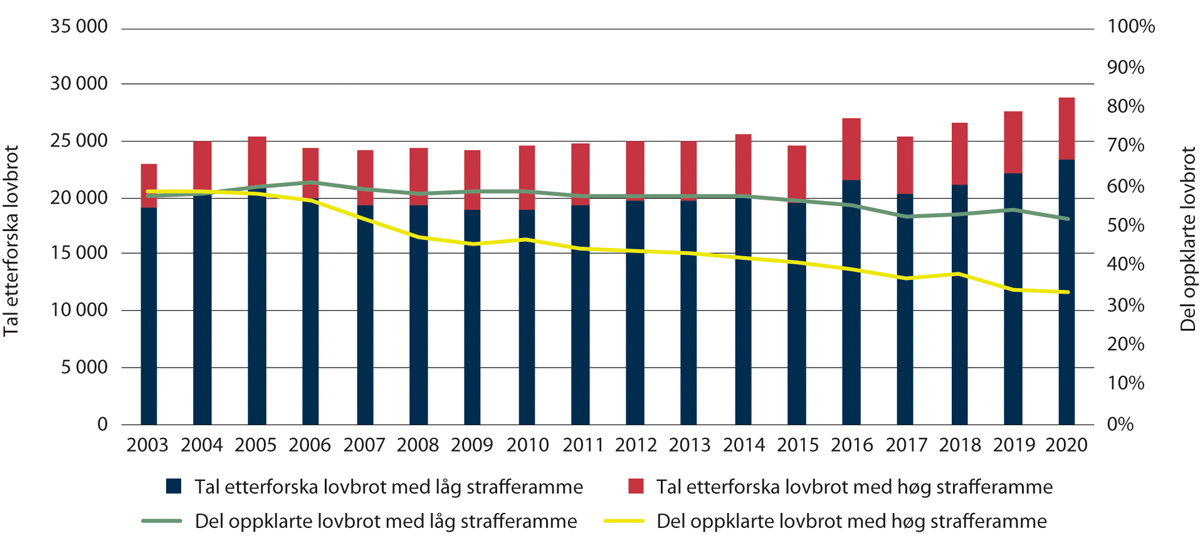 Oppklaringsprosent gir informasjon om rettstryggleiken, og oppklaringsprosenten i straffesaker har samla sett gått ned. Det gjeld særleg i alvorlege saker som politiet skal prioritere, t.d. grov vald og truslar, seksuallovbrot og økonomisk kriminalitet. Oppklaringsprosenten for lovbrotsgruppa vald og truslar med høg strafferamme har gått betydeleg ned og var i 2020 på 33 pst. Samstundes har det vore ein auke i talet på melde saker. Oppklaringsprosenten er spesielt låg for mishandling i nære relasjonar, der berre 18 pst. av sakene vart oppklarte i 2020.