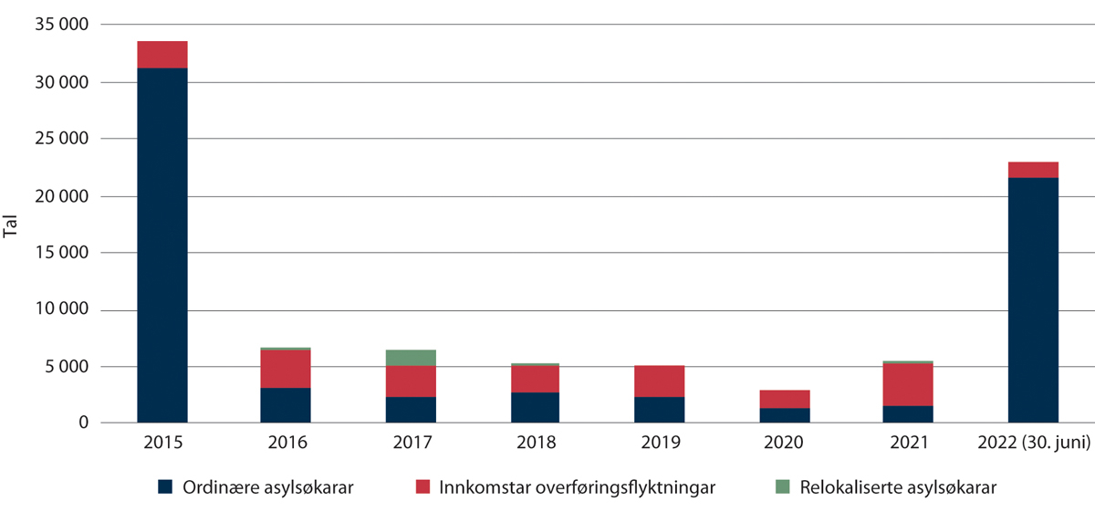 For å handtere auke i asylinnkomstar (i hovudsak fordrivne frå Ukraina) i samsvar med prognosane frå juni, legg regjeringa òg opp til å auke løyvinga til Utlendingsdirektoratet med nær 1,2 mrd. kroner i 2023, samanlikna med saldert budsjett for 2022. Auken er i hovudsak knytte til innkvartering i asylmottak, medrekna utgifter til mottaka, tilskot til vertskommunar og stønader til bebuarar. Det er stor uvisse om utviklinga framover, og behovet kan endrast. I tillegg foreslår regjeringa å løyve til saman 304,6 mill. kroner til ein auke i administrativ kapasitet i politiet (225 mill. kroner) og UDI (79,6 mill. kroner) for å ha beredskap til å handtere vesentleg fleire innkomstar frå Ukraina i 2023 enn det som ligg til grunn i prognosane frå juni.