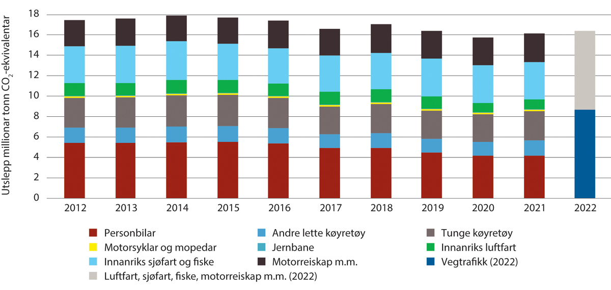 I dei førebelse tala for transport for 2022 har klimagassutsleppa auka med 2,8 pst. frå 2005 og 1,4 pst. frå 2021 til 2022. Auken ser ut til å kome av meir bruk av jetparafin. Sal av jetparafin auka med 78 pst. frå 2021 til 2022. Samstundes har salet av autodiesel og bilbensin gått ned noko. Bruken av biodrivstoff auka med 7 pst. i same periode. Samla køyrelengde for personbilar auka med 0,6 pst. frå 2021 til 2022. Denne auken gjeld i hovudsak elbilar. Bruken av elektriske køyretøy held fram med å auke, og dei stod for 22,6 pst. av samla køyrelengde i 2022.