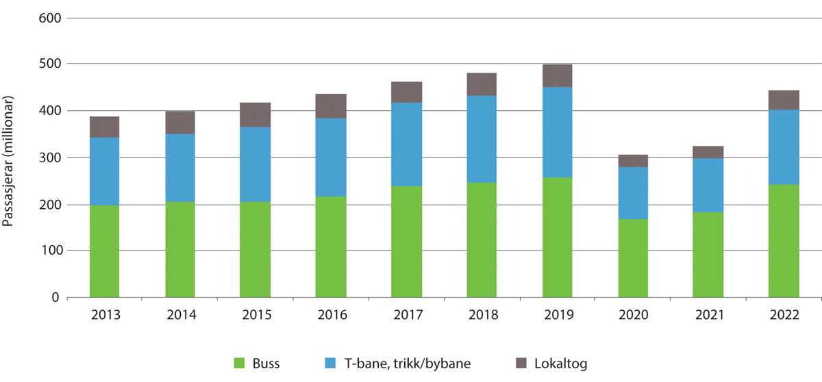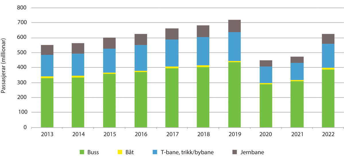 Statistikken for innanlandsk transport viser at persontransporten auka for vegtransport, jernbane, luftfart og sjøtransport. Godstransporten gjekk ned for sjøtransport, mens vegtransport og luftfart gjekk opp. Samla sett gjekk persontransporten (målt i personkilometer) opp med 10 pst. frå 2021 til 2022, og godstransporten gjekk opp med knapt 5 pst. i same periode.